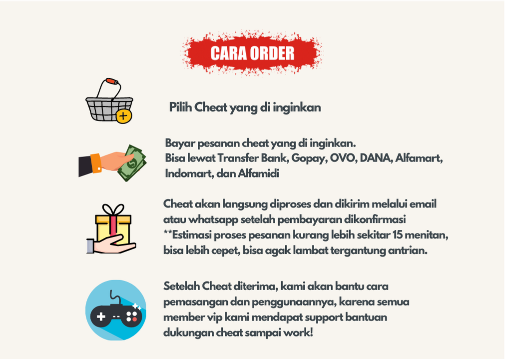 *Note: Setelah bukti pembayaran kami terima, cheat akan langsung dikirim beserta link grup cheat VIP nya melalui WhatsApp atau Email secepatnya setelah bukti transfer dikonfirmasi.