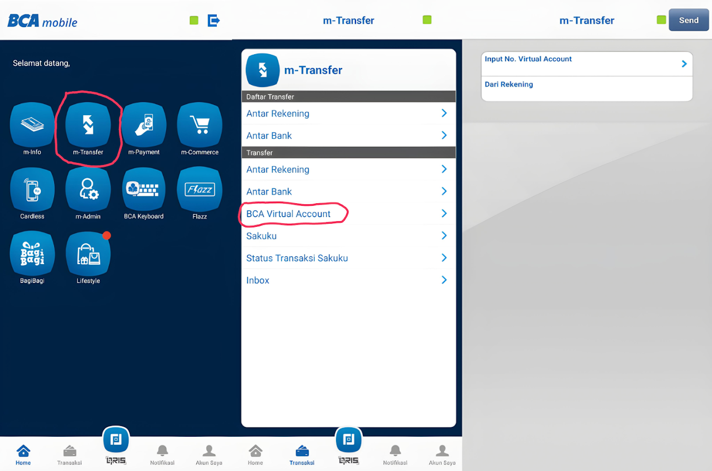 - Pada menu m-Transfer, kemudian pilih “Transfer BCA Virtual Account”